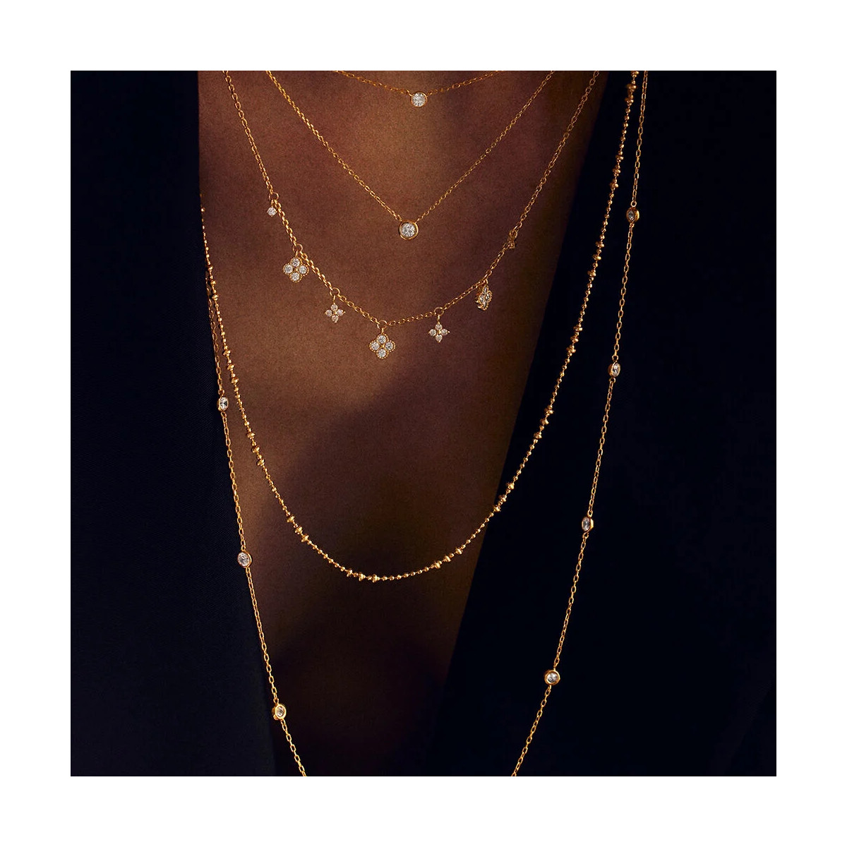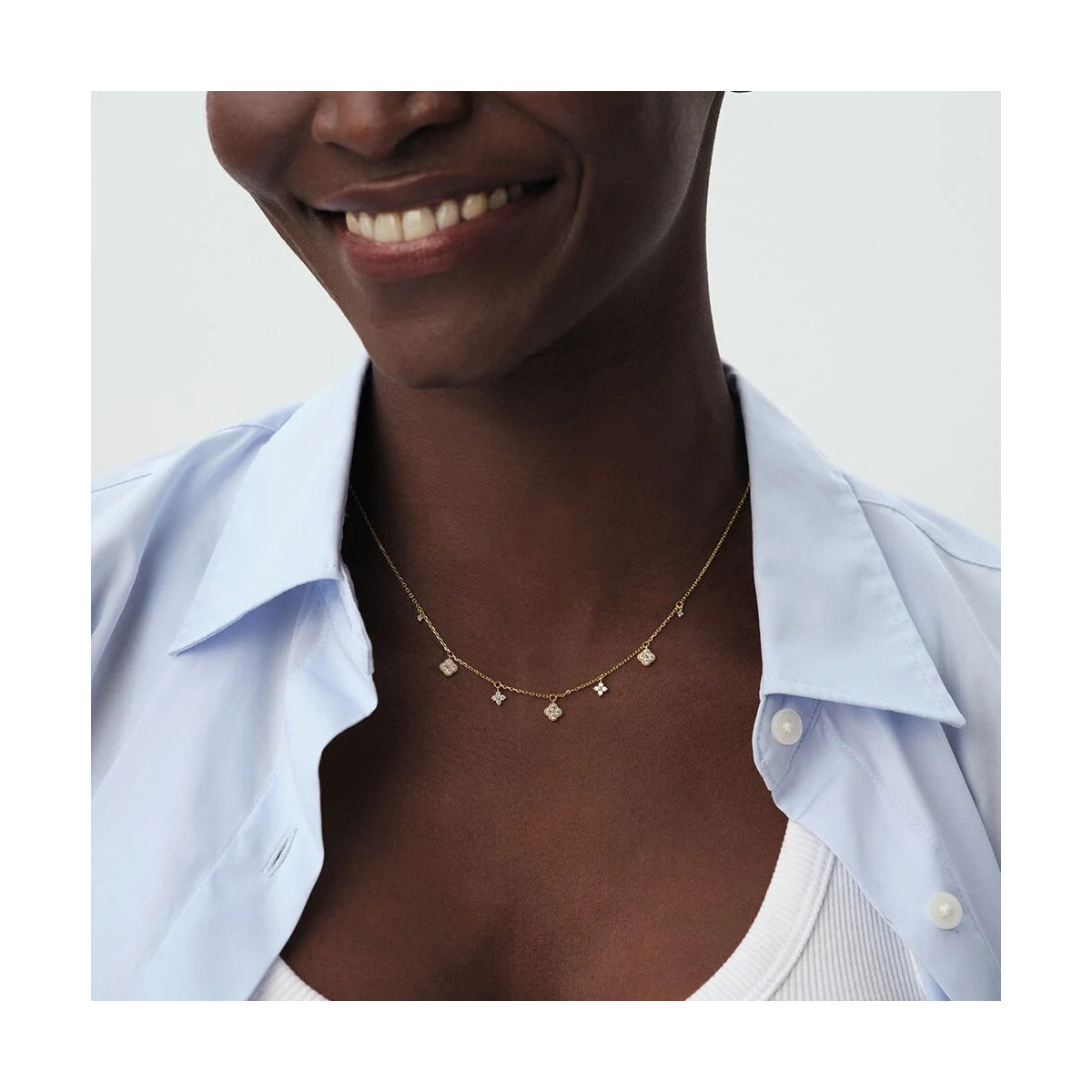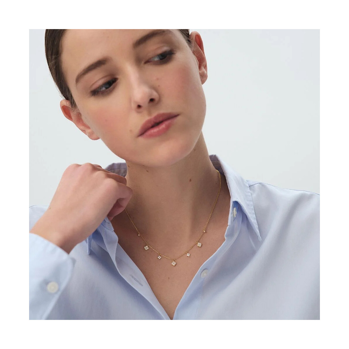 Collar de plata de ley bañado con 1 micra de oro de 18k y mini colgantes con circonitas. Llevable, combinable y tendencia, ¡el mix perfecto! Solo te queda decidir si prefieres la versión más neutra con circonitas blancas o el push de color definitivo para todos tus looks con las circonitas de colores.. Esta joya mide 420mm y tiene un alargo de 50mm